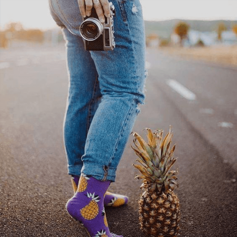El sabor tropical de la piña o ananá en amarillo sobre morado destacará en tus pies. Este diseño especial para aquellos que llaman la atención de manera recatada.