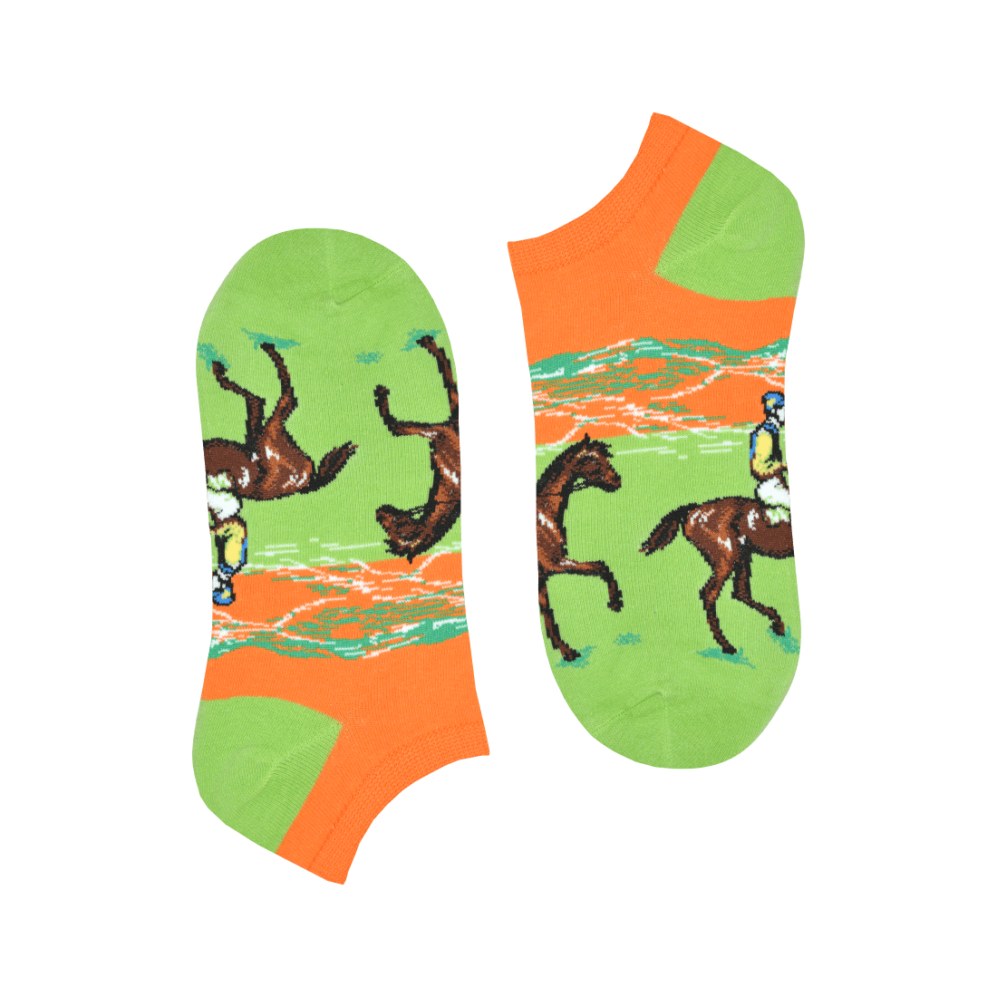 Una escena hípica que muestra un jockey sobre su caballo en café y cuerpo en verde y naranja. Para los amantes de los caballos y de las carreras este es un diseño perfecto. Medias tobilleras hombre, medias tobilleras mujer, medias tobilleras unisex.