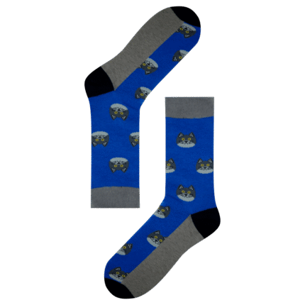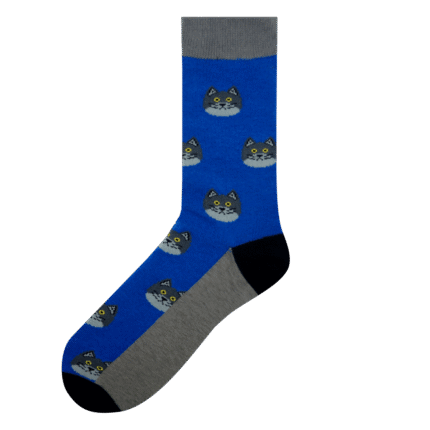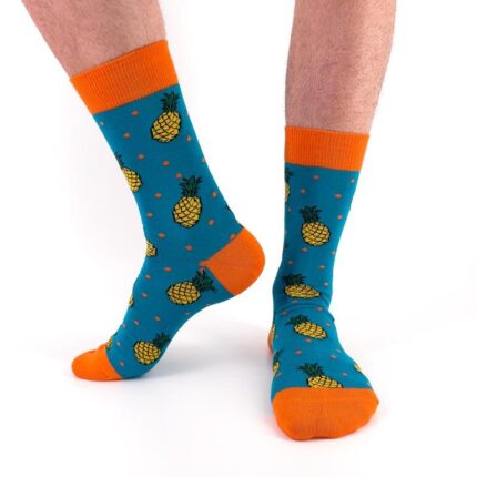 Una par de medias tobilleras en azul oscuro y llena de pepas negras y amarillas ubicadas aleatoriamente. Un diseño informal en un color no tan atrevido con toques de atrevimiento aquí y allá.